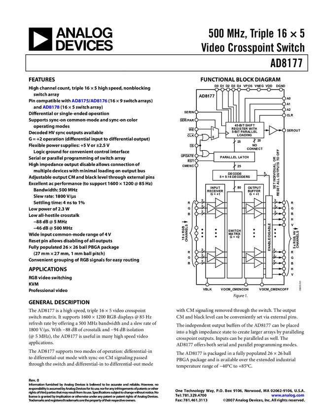 AD8177 500 MH, Triple 16 × 5 Video Crosspoint Switch