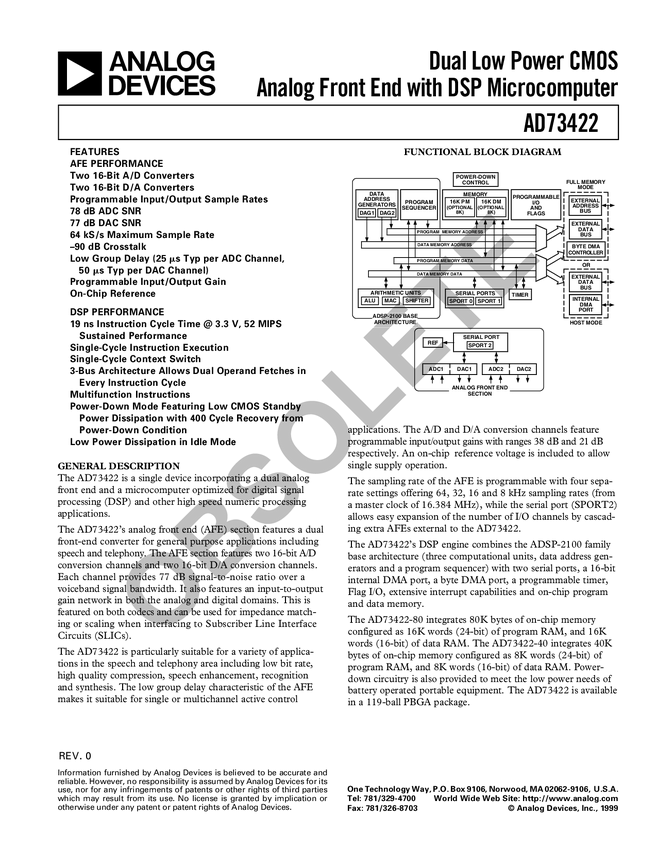 AD73422 Dual Low-Power CMOS Analog Front End with DSP Microcomputer