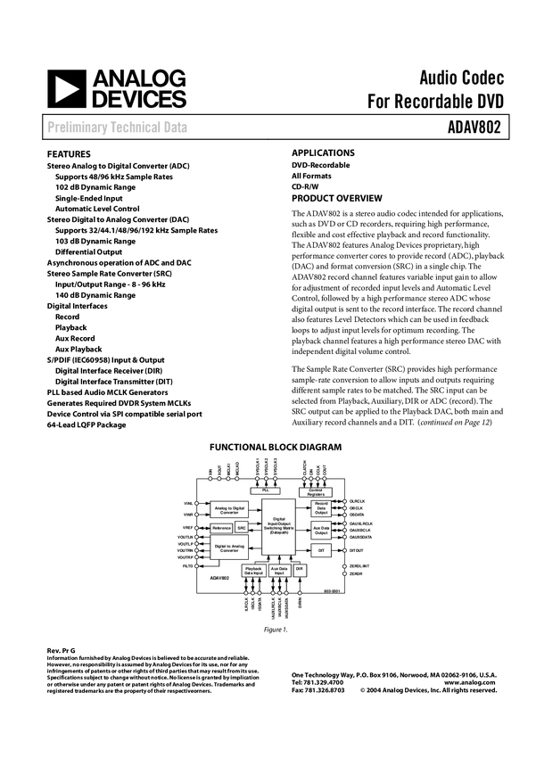 ADAV802 Stereo Codec with Differential DAC Outputs, SPDIF and SPI Interface