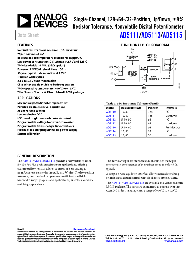 AD5111 Single Channel, 64-Position, Up/Down, ±8 % Resistor Tolerance, Nonvolatile...