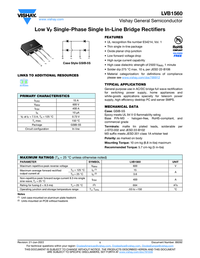 LVB1560 Low VF Single-Phase Single In-Line Bridge Rectifiers