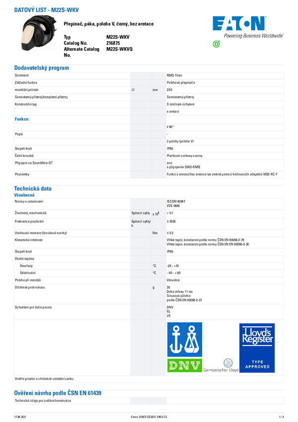 216875 Eaton 216875 M22S-WKV Przełącznik ścienny pierścień przedni z tworzywa sztu...