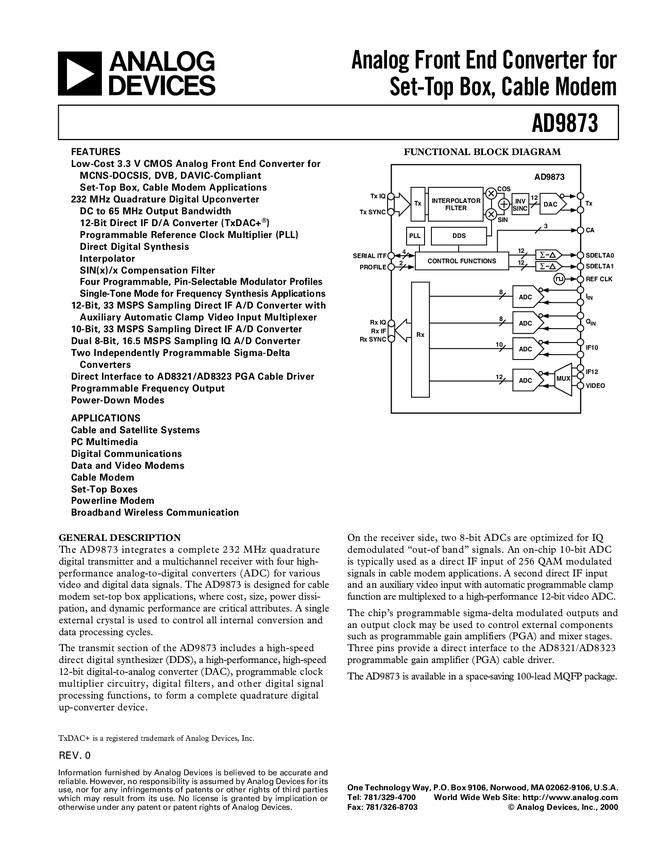AD9873 Analog Front End Converter for Set-Top Box, Cable Modem