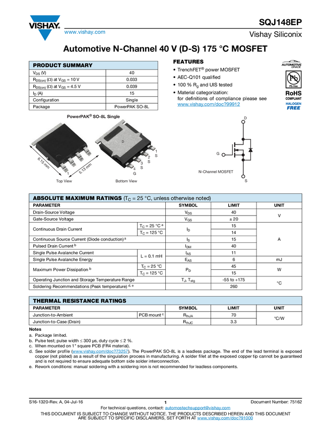 SQJ148EP Automotive N-Channel 40 V (D-S) 175 °C MOSFET