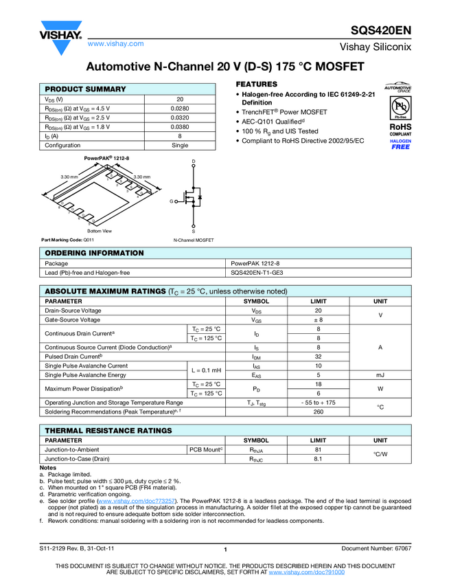 SQS420EN Automotive N-Channel 20 V (D-S) 175 °C MOSFET