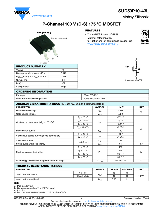 SUD50P10-43L P-Channel 100 V (D-S) 175 °C MOSFET