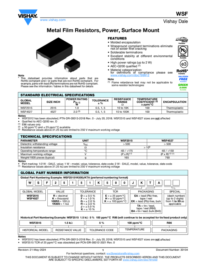 WSF Metal Film Resistors, Power, Surface Mount
