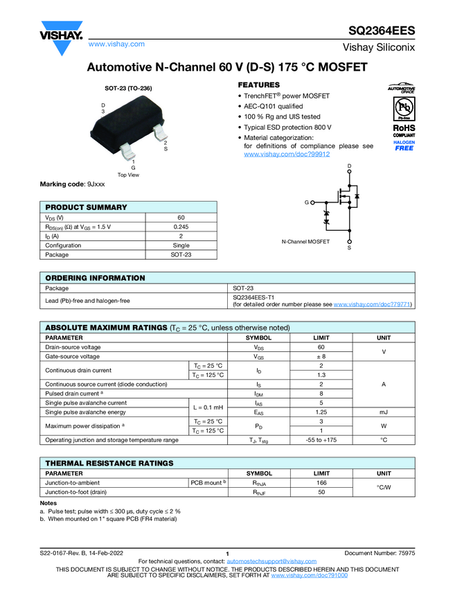 SQ2364EES Automotive N-Channel 60 V (D-S) 175 °C MOSFET