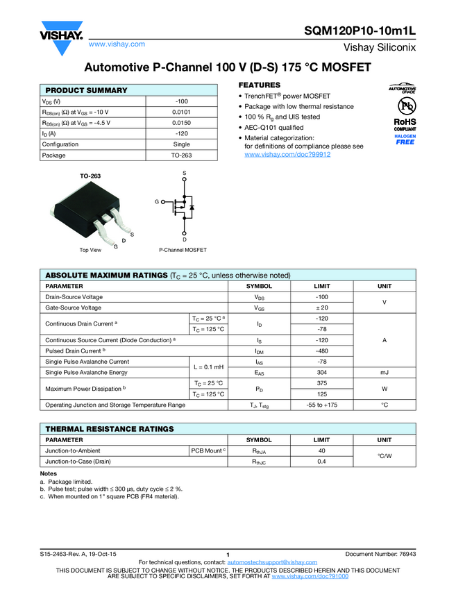 SQM120P10-10m1L Automotive P-Channel 100 V (D-S) 175 °C MOSFET