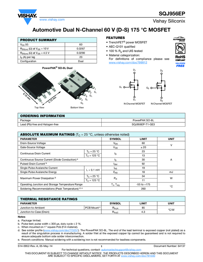 SQJ956EP Automotive Dual N-Channel 60 V (D-S) 175 °C MOSFET