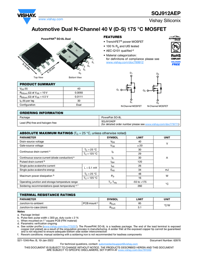 SQJ912AEP Automotive Dual N-Channel 40 V (D-S) 175 °C MOSFET