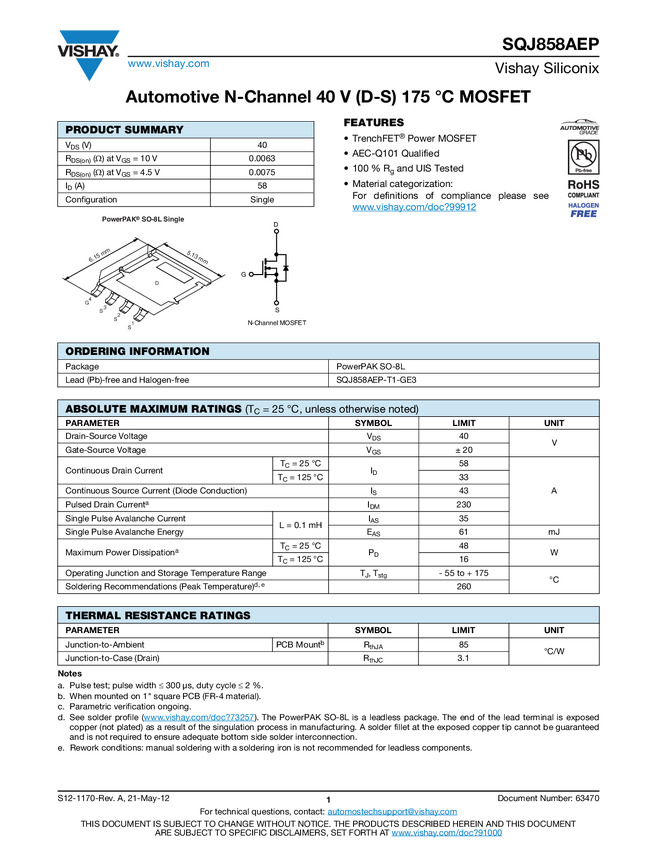SQJ858AEP Automotive N-Channel 40 V (D-S) 175 °C MOSFET