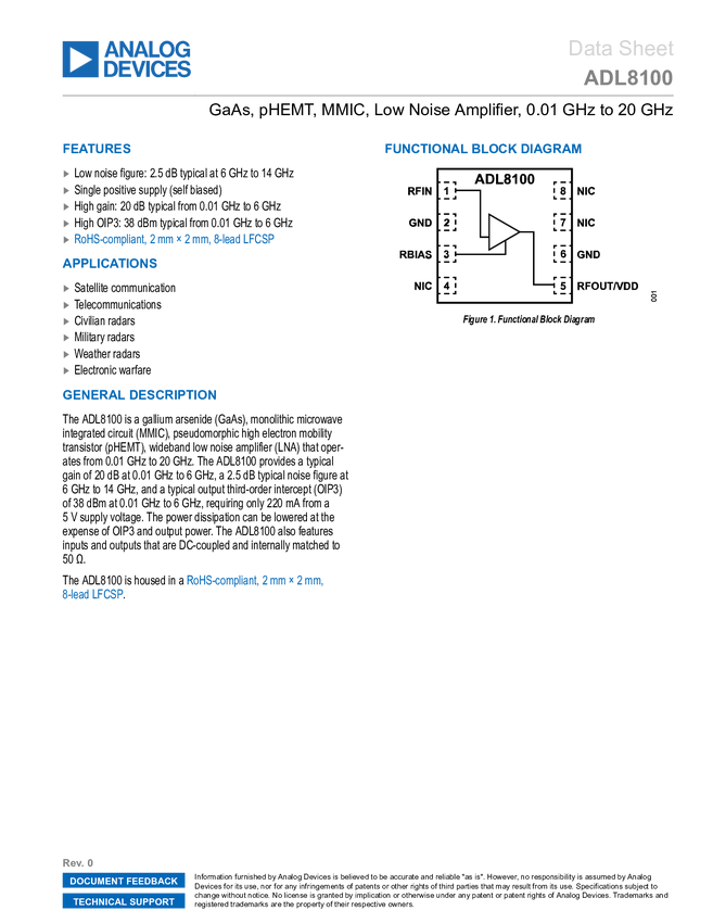 ADL8100 GaAs, pHEMT, MMIC, Low Noise Amplifier, 0.01 GHz to 20 GHz