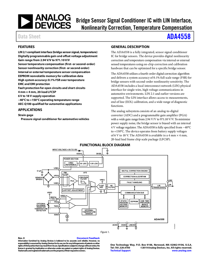 ADA4558 Bridge Sensor Signal Conditioner IC with LIN Interface, Nonlinearity Correc...