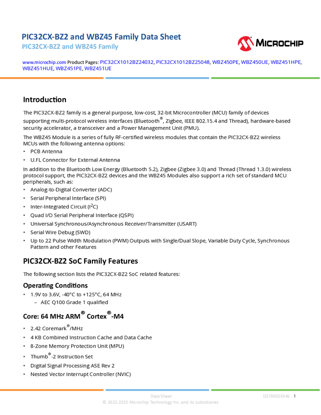 WBZ451PE, WBZ451HUE, WBZ451HPE, WBZ450UE, WBZ450PE, PIC32CX1012BZ25048, PIC32CX1012BZ24032
