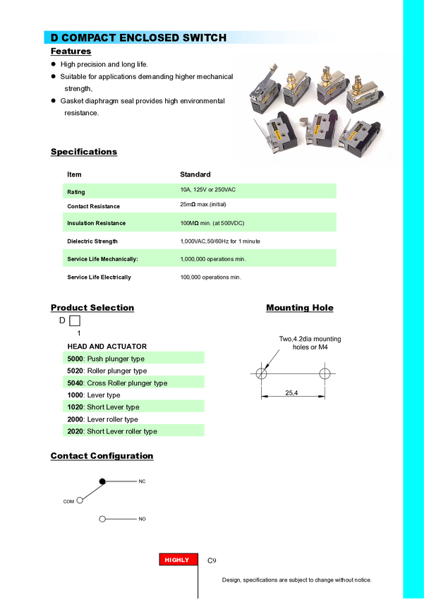 Przełącznik krańcowy; D1020; dźwignia; 49,2mm; 1NO+1NC wspólny pin; szybkie; śrubowy; 10A; 250V; IP40; Highly; RoHS