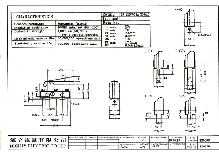 Mikroprzełącznik; SS0508A; dźwignia; 50mm; 1NO+1NC; wspólny pin; szybkie; lutowany; 3A; 250V; Highly; RoHS