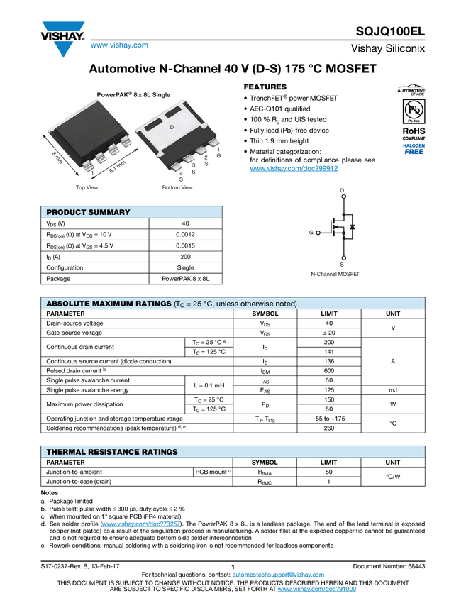SQJQ100EL Automotive N-Channel 40 V (D-S) 175 °C MOSFET