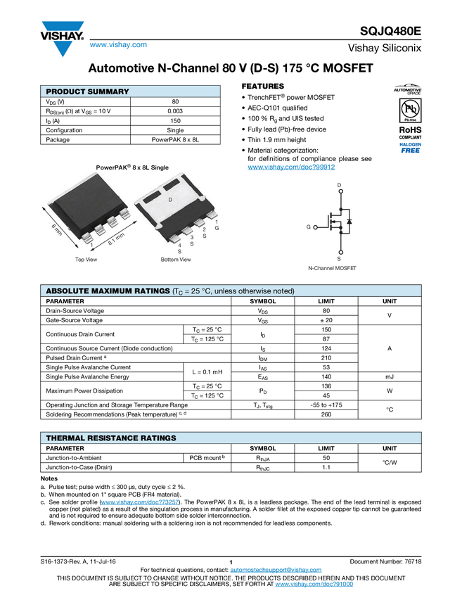 SQJQ480E Automotive N-Channel 80 V (D-S) 175 °C MOSFET