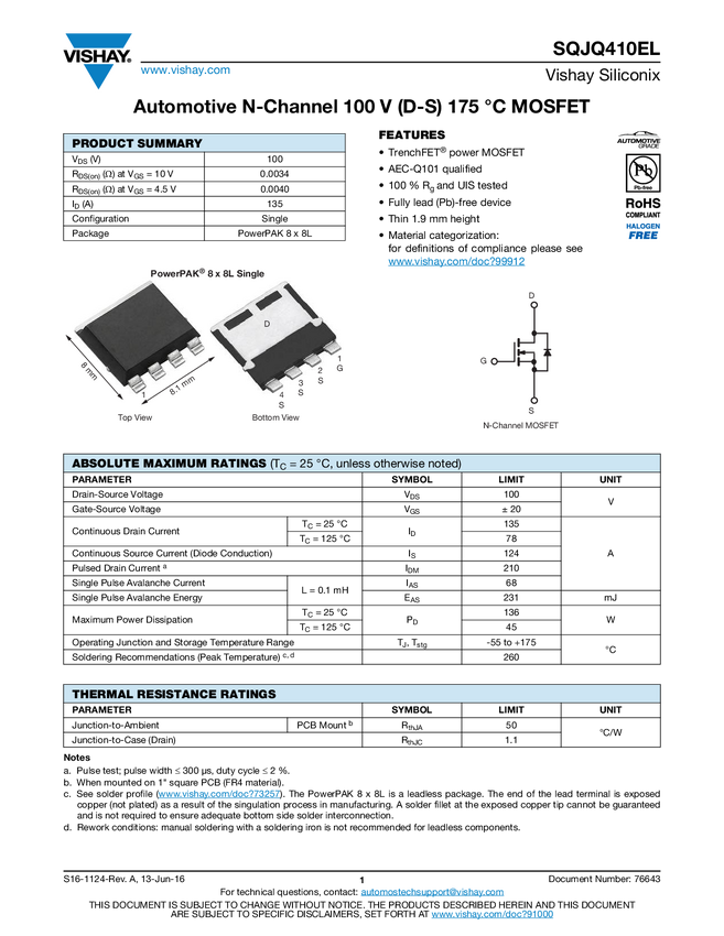 SQJQ410EL Automotive N-Channel 100 V (D-S) 175 °C MOSFET