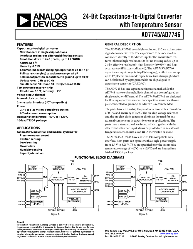 AD7746 24-bit, 1 Channel Capacitance to Digital Converter