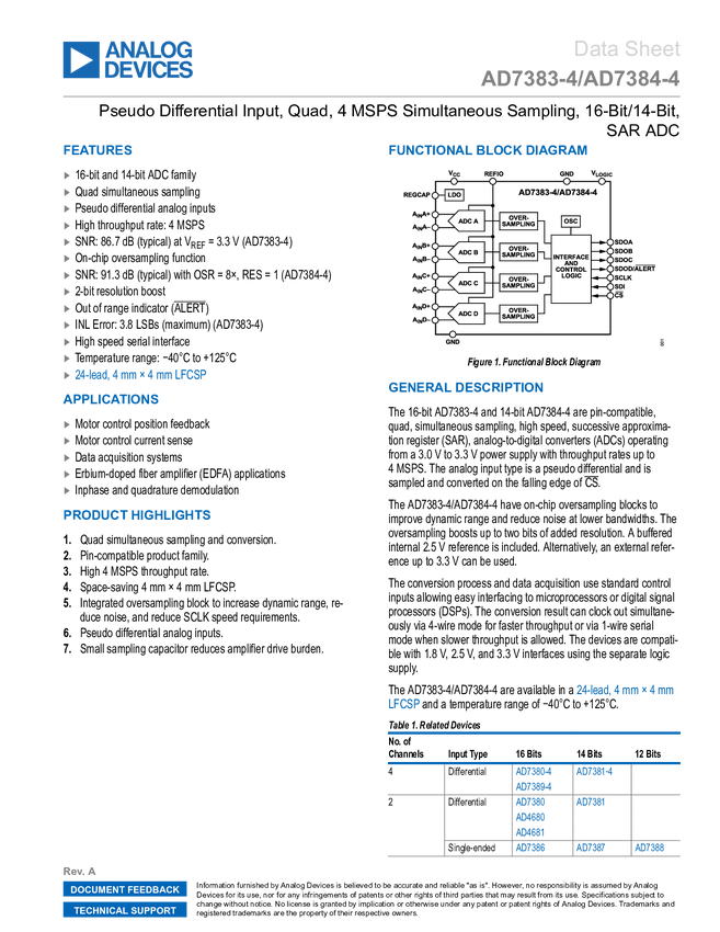 AD7383-4 Pseudo Differential Input, Quad, 4 MSPS Simultaneous Sampling, 16-Bit, SAR...