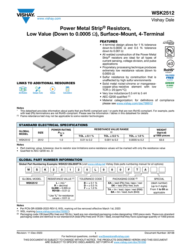 WSK2512 Power Metal Strip® Resistors, Low Value (Down to 0.0005 Ω), Surfa...