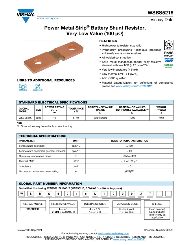 WSBS5216 Power Metal Strip® Battery Shunt Resistor, Very Low Value (100 µ&...