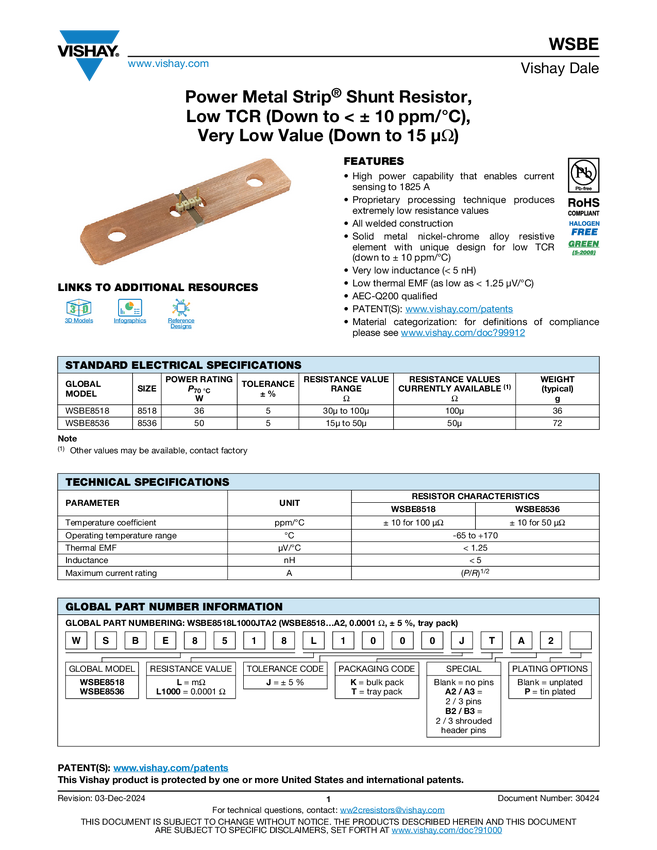 WSBE Power Metal Strip® Shunt Resistor, Low TCR (Down to < ± 10 ppm...