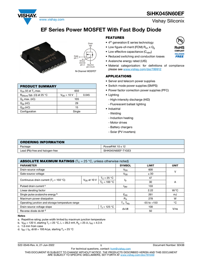 SiHK045N60EF EF Series Power MOSFET With Fast Body Diode
