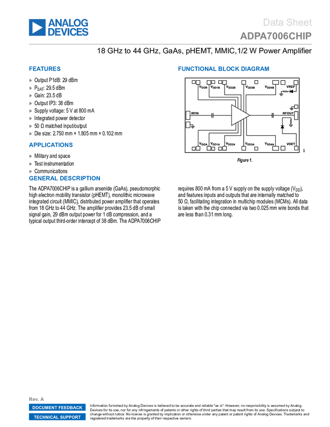 ADPA7006 18 GHz to 44 GHz, GaAs, pHEMT, MMIC, 1/2 W Power Amplifier