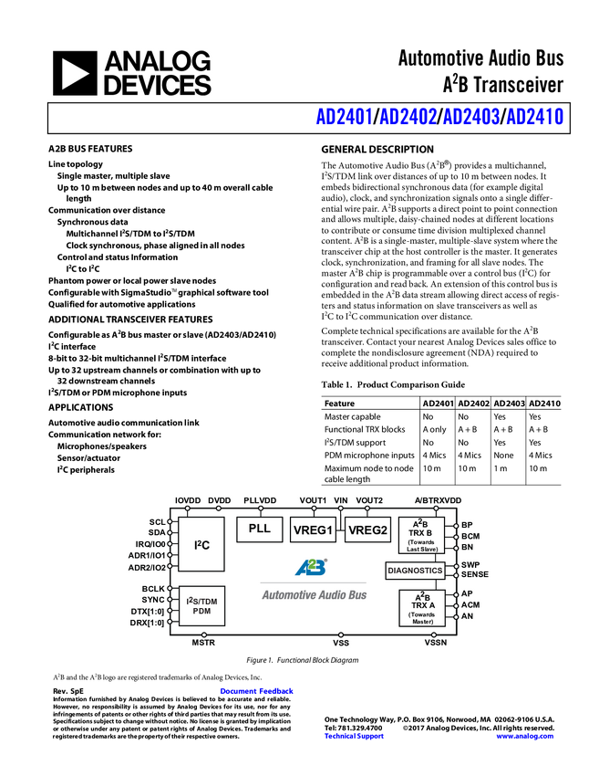 AD2401 Automotive Audio Bus Transceiver (AB); Multi-Slave Serial Audio Interface w...