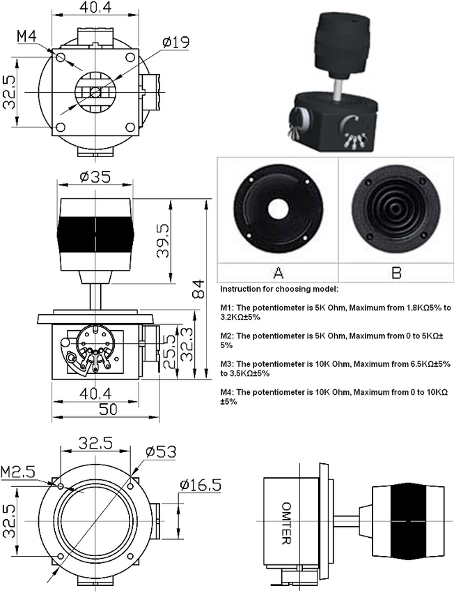 Przełącznik; joystick; OM300B-M4; potencjometryczny; 10kOhm; 360°; monostabilny; pozycja stabilna: 1; 3-osie; na panel; do lutowania; 25mm; 157g; OMTER; RoHS
