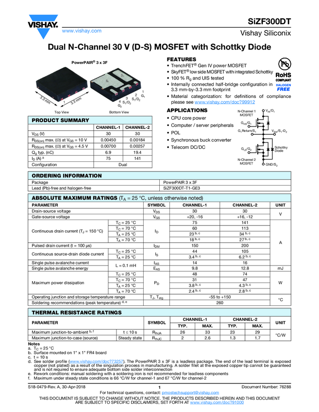 SiZF300DT Dual N-Channel 30 V (D-S) MOSFET with Schottky Diode