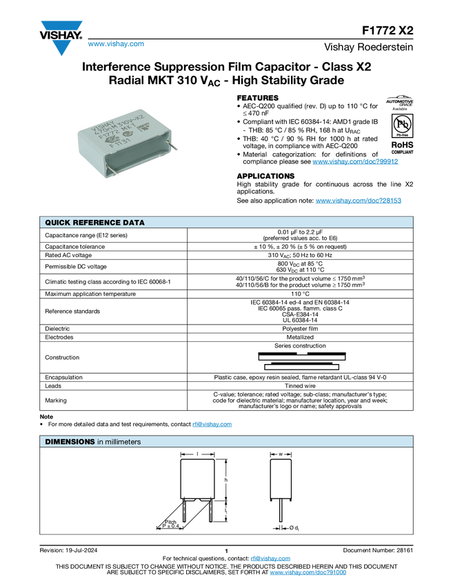 F1772 X2 Interference Suppression Film Capacitor - Class X2 Radial MKT 310 VAC - Hig...