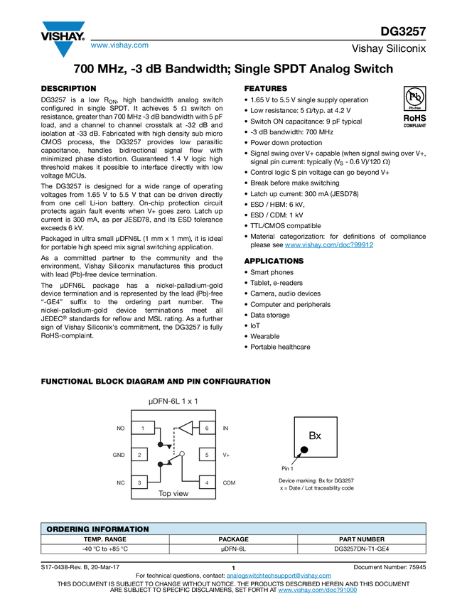DG3257 700 MHz, -3 dB Bandwidth; Single SPDT Analog Switch
