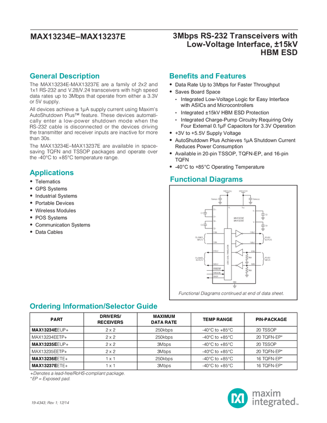 MAX13234E 3Mbps RS-232 Transceivers with Low-Voltage Interface, ±15kV HBM ESD
