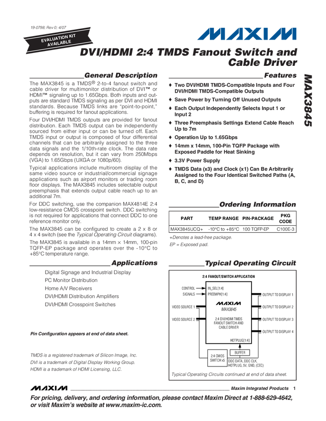 MAX3845 DVI/HDMI 2:4 TMDS Fanout Switch and Cable Driver