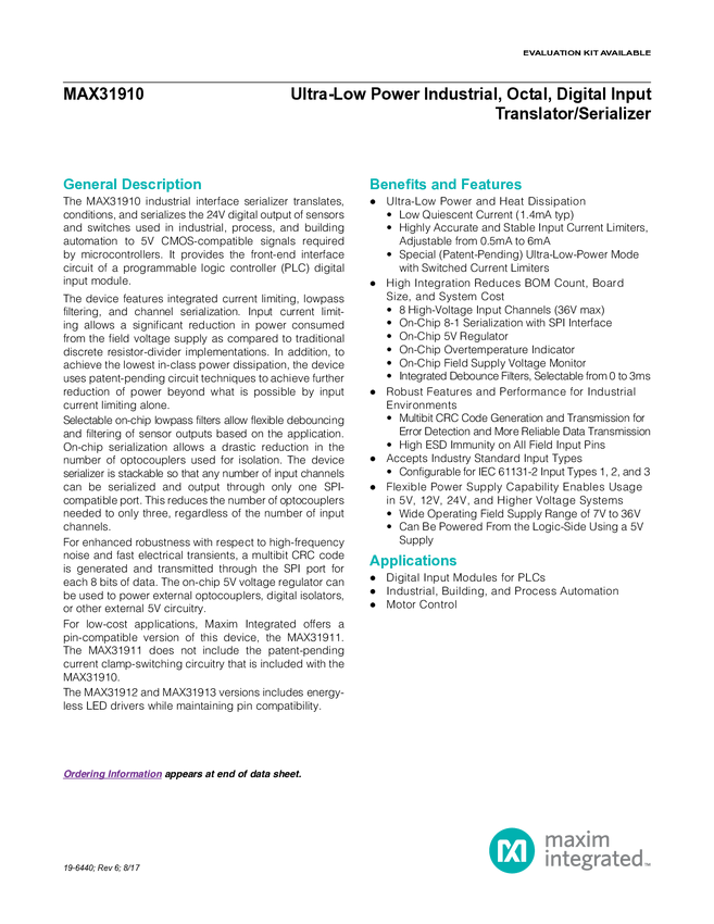 MAX31910 Ultra-Low Power Industrial, Octal, Digital Input Translator/Serializer