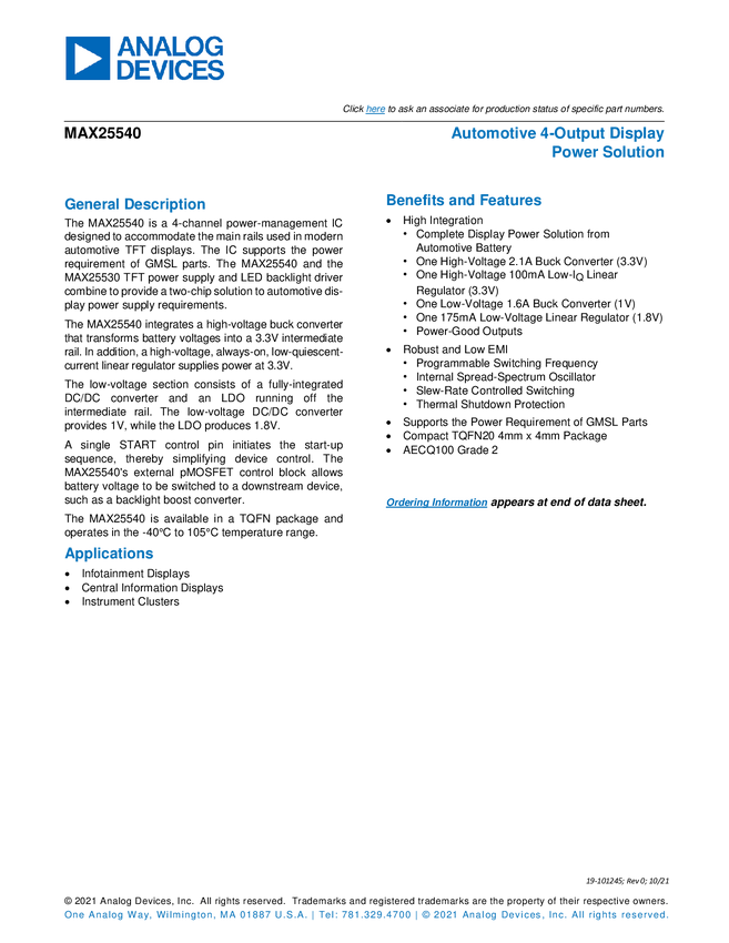 MAX25540 Automotive 4-Output Display Power Solution