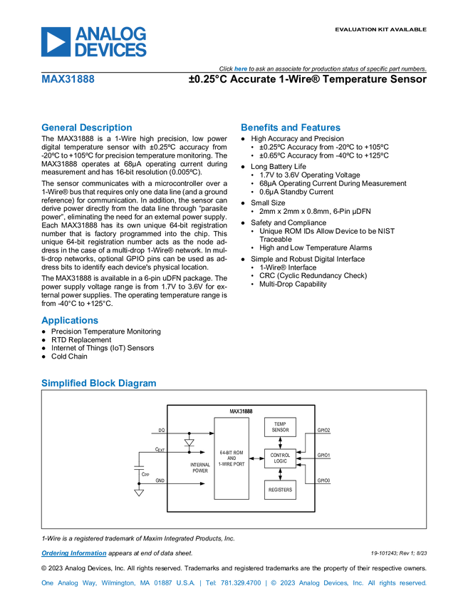 MAX31888 ±0.25°C Accurate 1-Wire Temperature Sensor