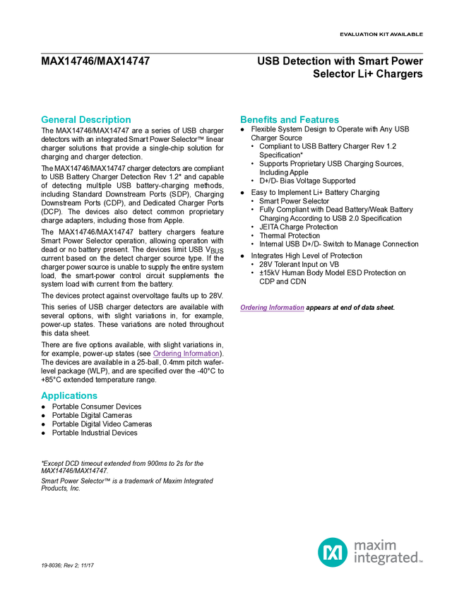 MAX14746 USB Detection with Smart Power Selector Li+ Chargers