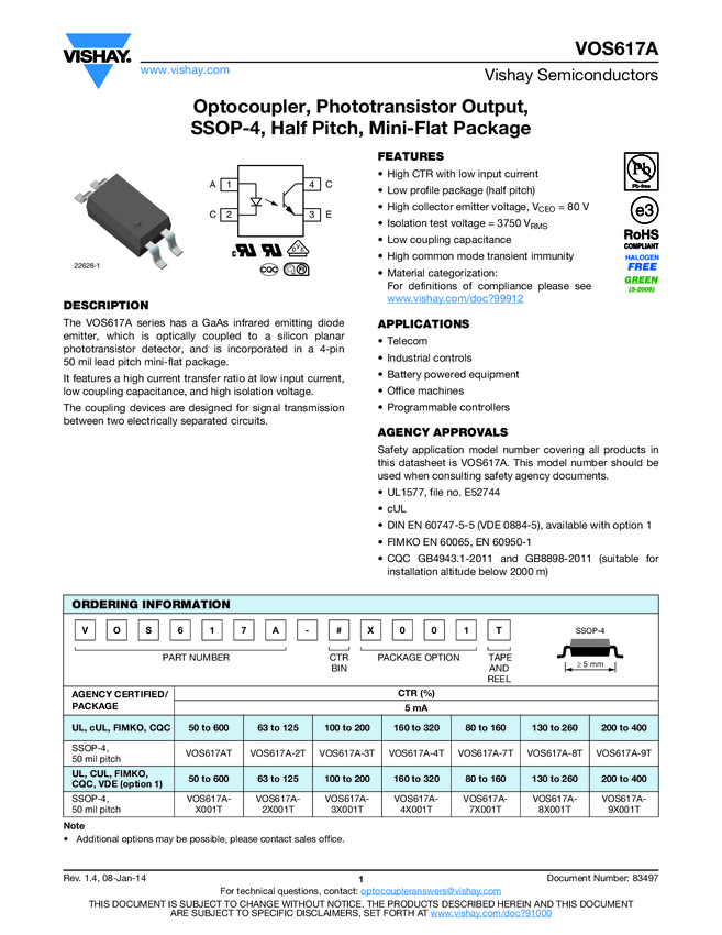 VOS617A Optocoupler, Phototransistor Output, SSOP-4, Half Pitch, Mini-Flat Package