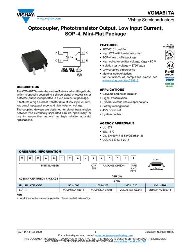 VOMA617A Optocoupler, Phototransistor Output, Low Input Current, SOP-4, Mini-Flat Pa...