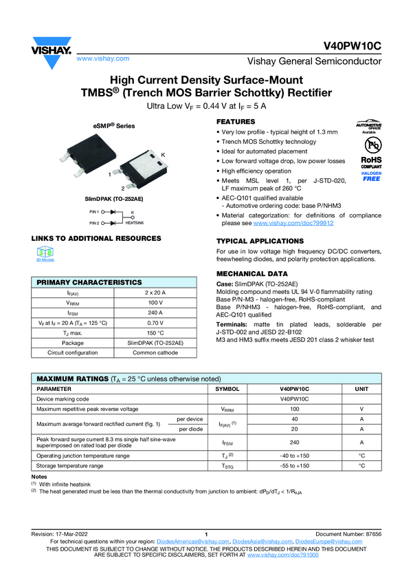 V40PW10C High Current Density Surface-Mount TMBS® (Trench MOS Barrier Schottky)...