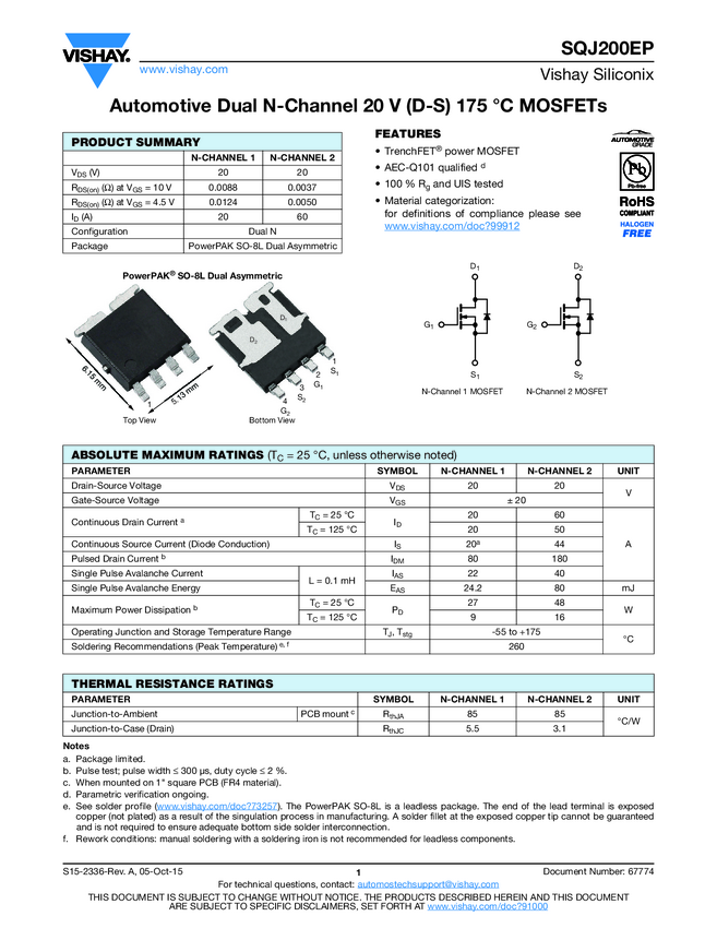 SQJ200EP Automotive Dual N-Channel 20 V (D-S) 175 °C MOSFETs