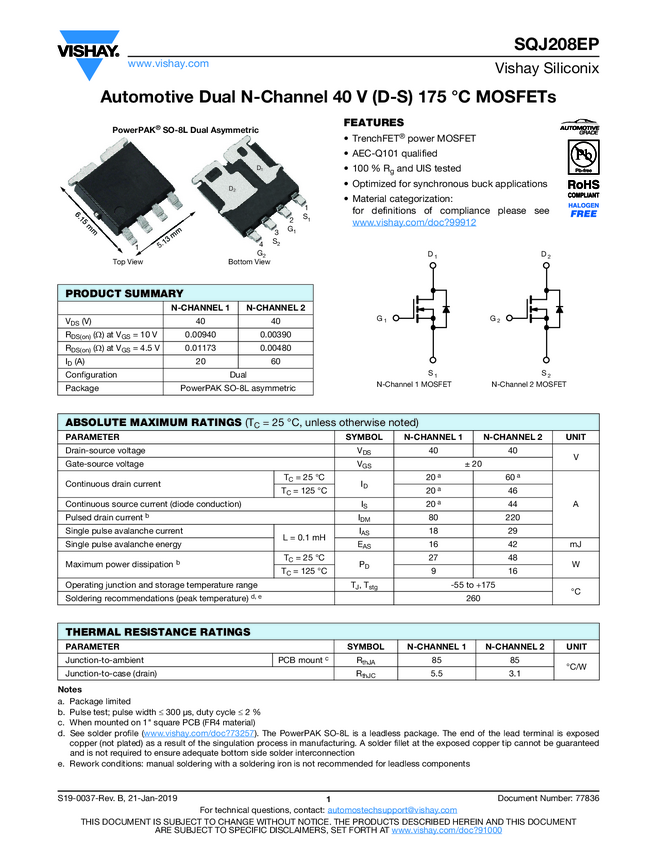 SQJ208EP Automotive Dual N-Channel 40 V (D-S) 175 °C MOSFETs