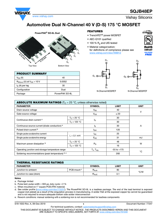 SQJB48EP Automotive Dual N-Channel 40 V (D-S) 175 °C MOSFET