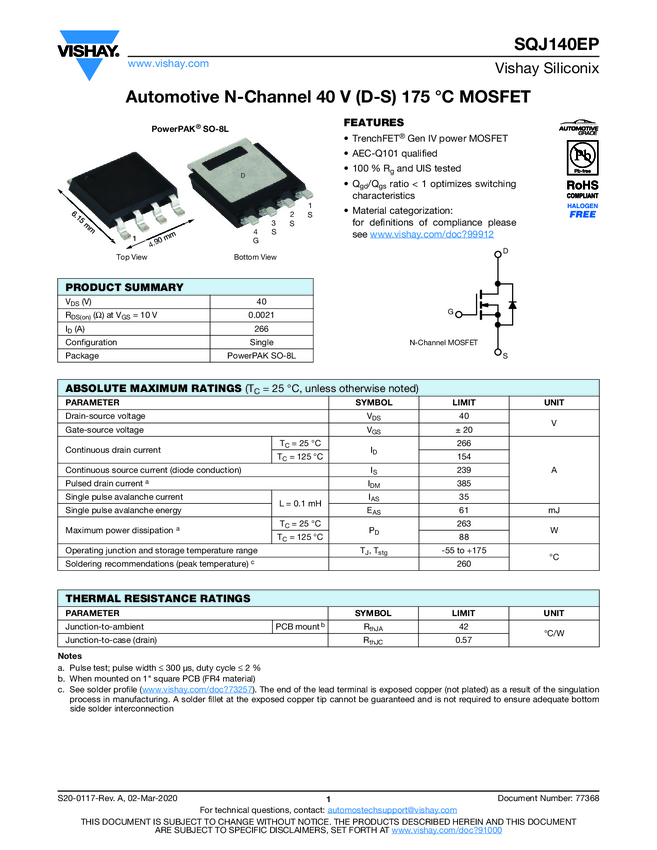 SQJ140EP Automotive N-Channel 40 V (D-S) 175 °C MOSFET