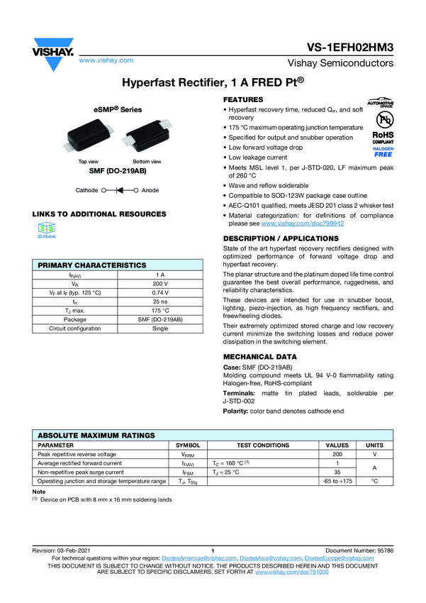 VS-1EFH02HM3 Hyperfast Rectifier, 1 A FRED Pt®